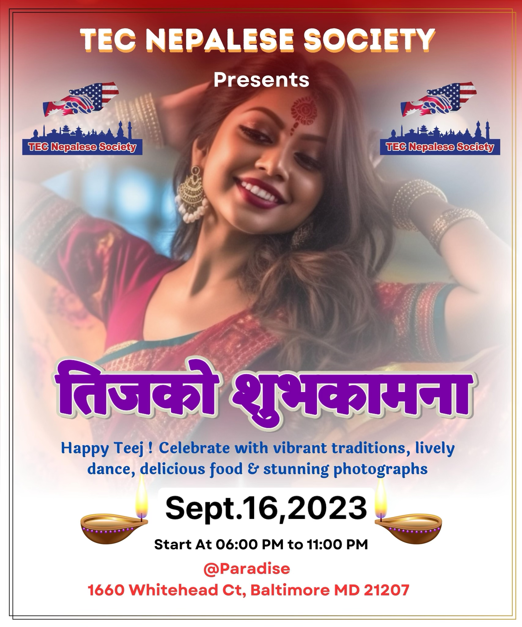 सबैमा नमस्कार । यस TEC Nepalese Society ले आयोजना गर्न लागेको TEC Nepalese TEEJ 2023 कार्यक्रम बिषेश कारणवश Sept. 9th Saturday वाट September 16th Saturday को दिन निम्न स्थान र समय मा सारिएको छ। यहाँहरु प्रति पर्न गएको असुबिधा प्रति हामि क्षमा याचना गर्दछौँ र सम्पूर्ण हजुरहरु प्रति निमन्त्रणा दिन चाहान्छौ। आउनुहोस सबै मिलीजुलि २०२३ को तिज रमाइलो गरि मनाऔं। Date: September 16th Saturday 2023 Time : 6: 00 PM - 11:00 PM Address: 1660 Whitehead Ct, Baltimore, MD 21207 मा […]