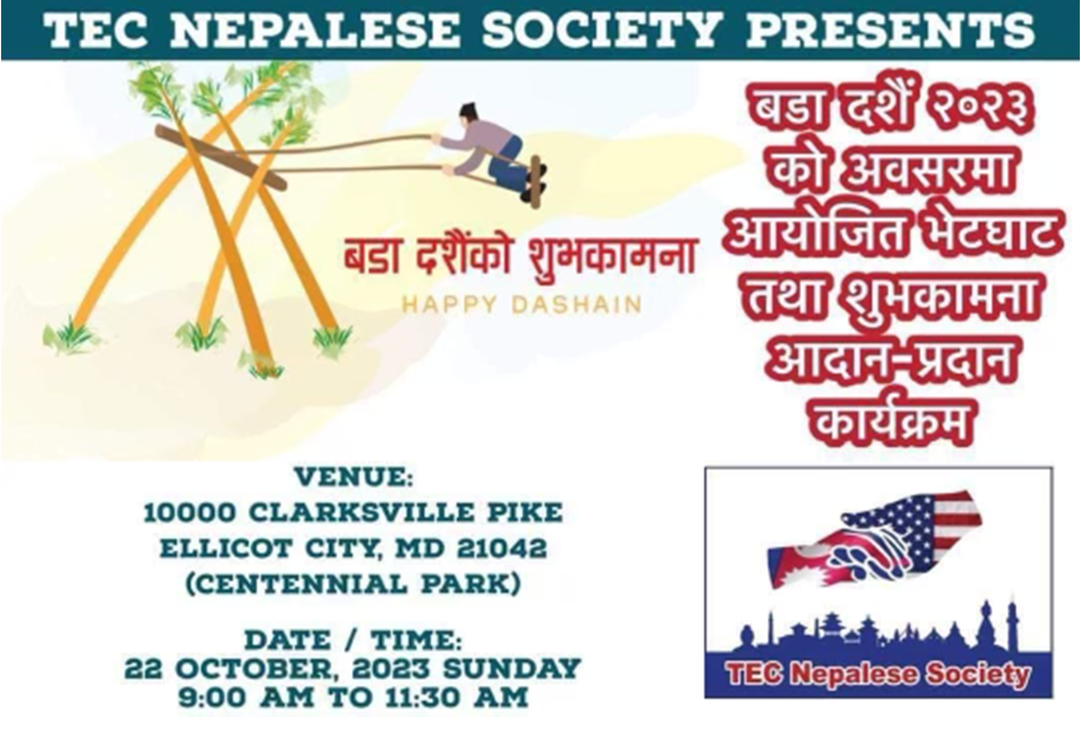 सबैमा नमस्कार !! यस TEC Nepalese Society ले यसैवर्षको नेपालीहरुको महान चाड तथा भेटघाट गर्ने उदेश्यले October 22, 2023 Sunday का दिन निम्न स्थान र समयमा दशैं शुभकामना आदानप्रदान कार्यक्रम राखेको हूँदा यहाँहरु सबैमा उपस्थिति तथा सहभागीता को लागी निमन्त्रणा गर्न चाहन्छौ। कार्यक्रममा शुभकामना आदानप्रदान को साथमा बिभीन्न खेलको आयोजना गरीनेछ । थप जानकारीको लागी संस्थाका उपाध्यक्ष तथा कार्यक्रमका संयोजक श्री नारायण सिंह गुरूङ ज्यू लाई phones number 443-985-7806 मा […]
